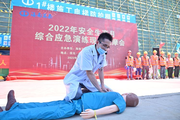 為貫徹落實習總書記關于安全生產重要論述,以黨建引領促進安全生產,全面提升項目質量管理水平,增強安全責任意識,按照上級相關主管部門對開展“安全生產月”活動的通知要求,結合第21個全國“安全生產月”,2022年6月28日,海南萬泰建筑工程有限公司在七彩瀾灣南區商業項目部成功舉辦了2022年“安全生產月”綜合應急演練觀摩會。省住建廳安全行業專家劉輝輝,澄邁縣住房和城鄉建設局莫丁,澄邁縣應急管理局冼厚霖,澄邁縣質監站王廣彬,中豪威爾房地產有限公司甲方代表孫志明,海南藍城君潤科技有限公司副總經理陳自衡、工程部經理張凡春,杭州巨烽建設工程項目管理有限公司總監朱冬風,公司常務副總經理顏利、副總經理吳坤芳等相關人員參加本次觀摩會。澄邁縣老城消防救援特勤站、同和醫院友情協助開展本次綜合應急演練。