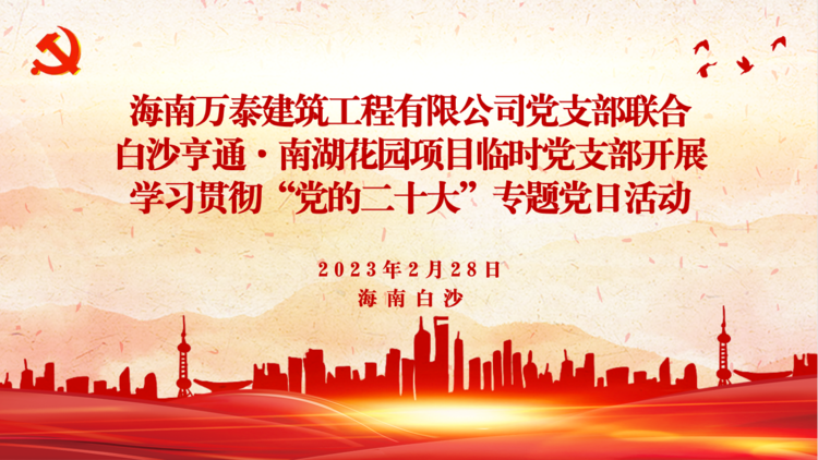 春暖花開,萬物可期。為學習貫徹落實黨的二十大會議精神,將黨建工作與業(yè)務工作有機結合,發(fā)揮基層黨組織戰(zhàn)斗堡壘的作用,在海南省質安局的關心指導下,2023年2月28日,海南萬泰公司黨支部、工程部有關負責同志到項目部現(xiàn)場為白沙亨通·南湖花園項目黨建聯(lián)建共創(chuàng)基地舉行揭牌儀式,并聯(lián)合項目臨時黨支部開展了學習貫徹“黨的二十大”專題黨日活動,同時,對項目工地的塔吊等重型機械進行了安全檢查。
