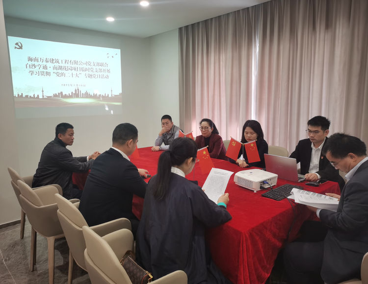隨后,海南萬泰公司黨支部、亨通·南湖花園項目臨時黨支部集中組織學習了黨的二十大會議精神、海南省住房和城鄉(xiāng)建設工作會議精神以及建筑行業(yè)有關法律法規(guī)。項目臨時黨支部書記何承中表示,在今后的工作開展中,將繼續(xù)堅持黨建引領項目建設,與項目部一同,不斷努力提升項目安全生產、文明施工、工程質量水平,確保項目后續(xù)建設工作順利進行。