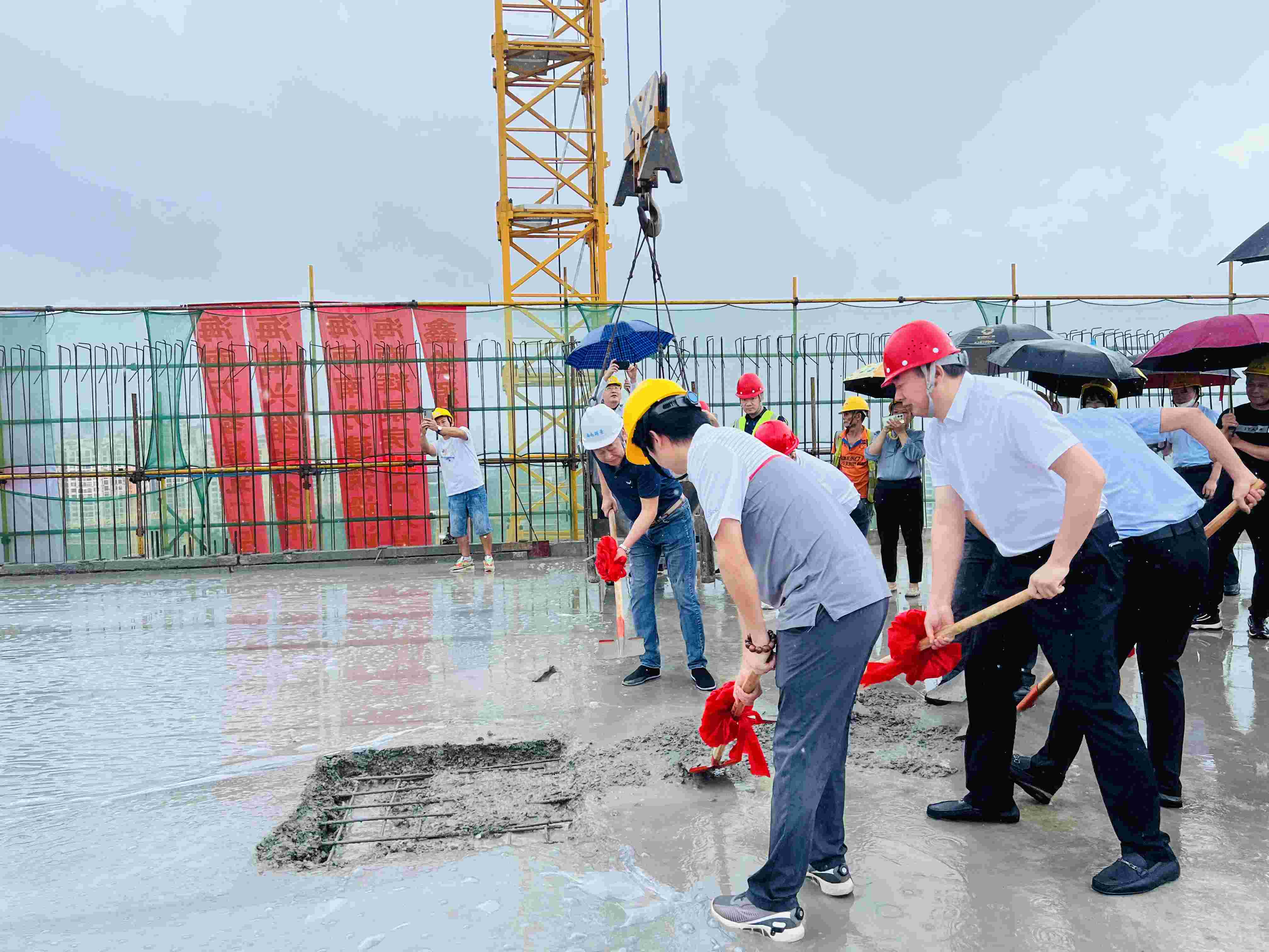 大家在做好安全防護措施后一起走上了頂樓,伴隨著禮花的炮鳴聲,共同為項目主體結構的最后一塊區域澆筑混凝土。隨后,海南萬泰公司顏利總正式宣布項目主體結構封頂成功。