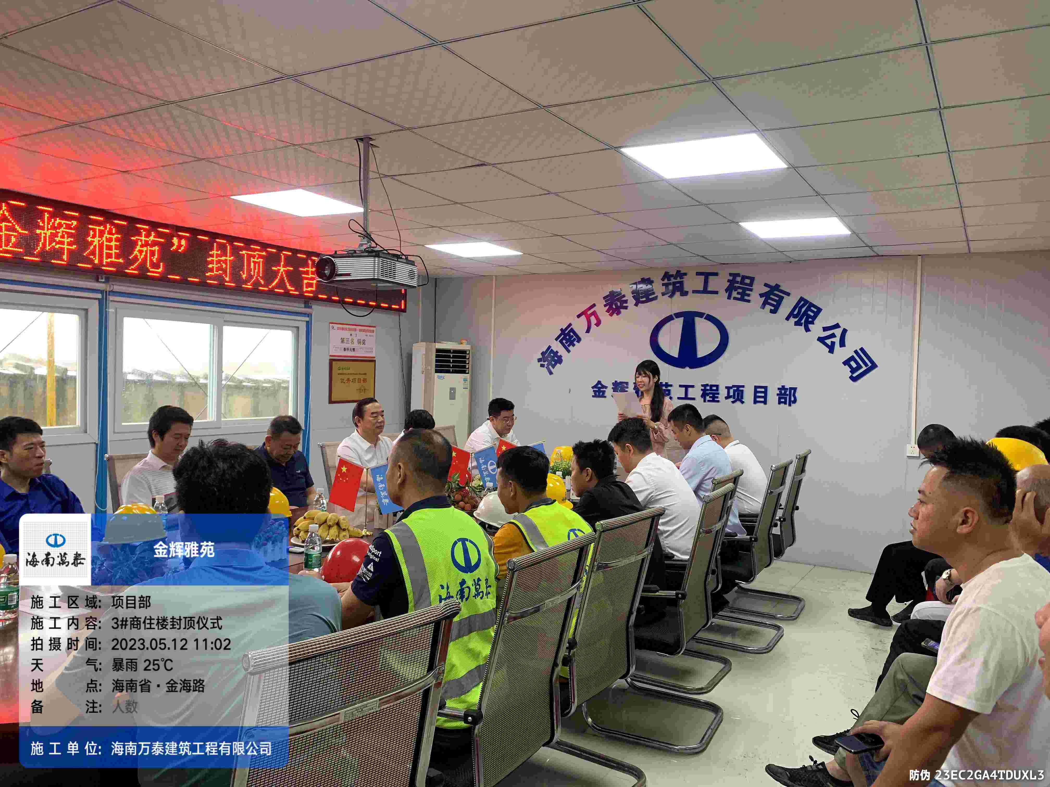 海南輝景地產董事長劉輝在講話中首先對瓊海金輝雅苑項目主體結構封頂表示祝賀,對海南萬泰項目管理團隊的工作能力給予了肯定,并由衷的感謝施工單位、監理單位以及各個施工班組的大力支持與辛勤付出,他表示整個項目主體建設工程進度符合計劃工期,同時對項目后期的建設提出了新的要求和期望。