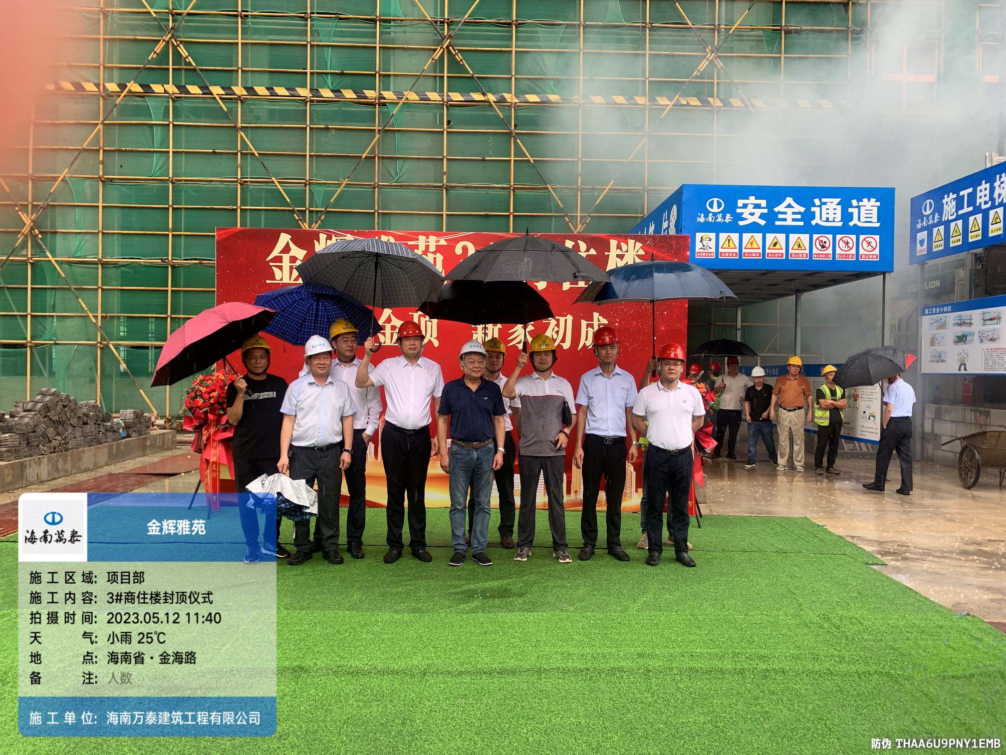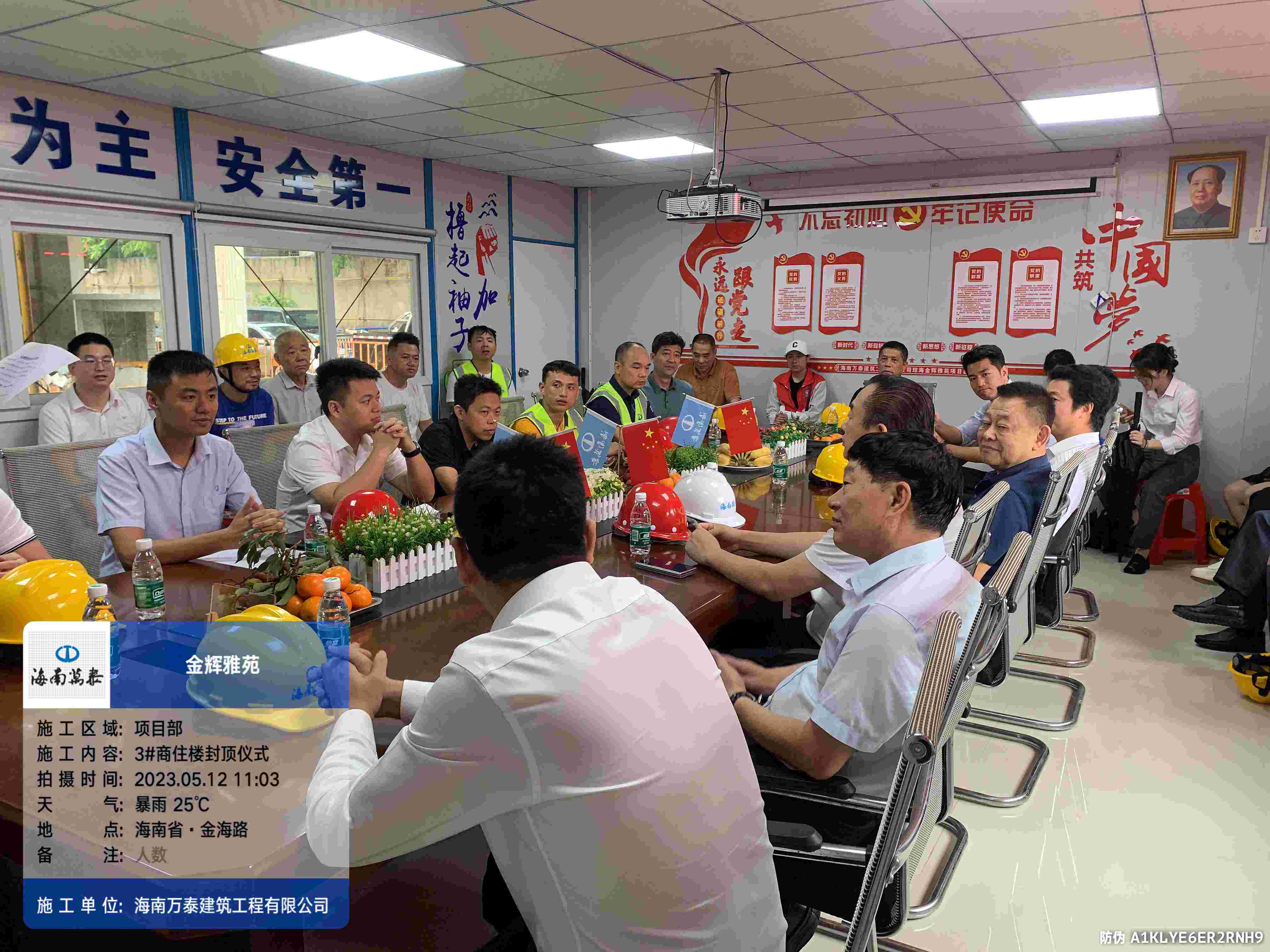金梁拔地千年固,玉柱擎天萬事興。2023年5月12日上午,海南萬泰承建的瓊海金輝雅苑項目喜封金頂,封頂儀式在項目工地現場圓滿舉辦,海南輝景房地產開發有限責任公司董事長劉輝、股東文靖杰、總經理陳小勇,海南萬泰建筑工程有限公司常務副總經理顏利、工程一處總助袁軍、工程部副部長張豪杰、項目經理劉達濱以及監理等參與和支持項目建設的各級領導出席了本次活動,共同見證這一喜慶時刻。